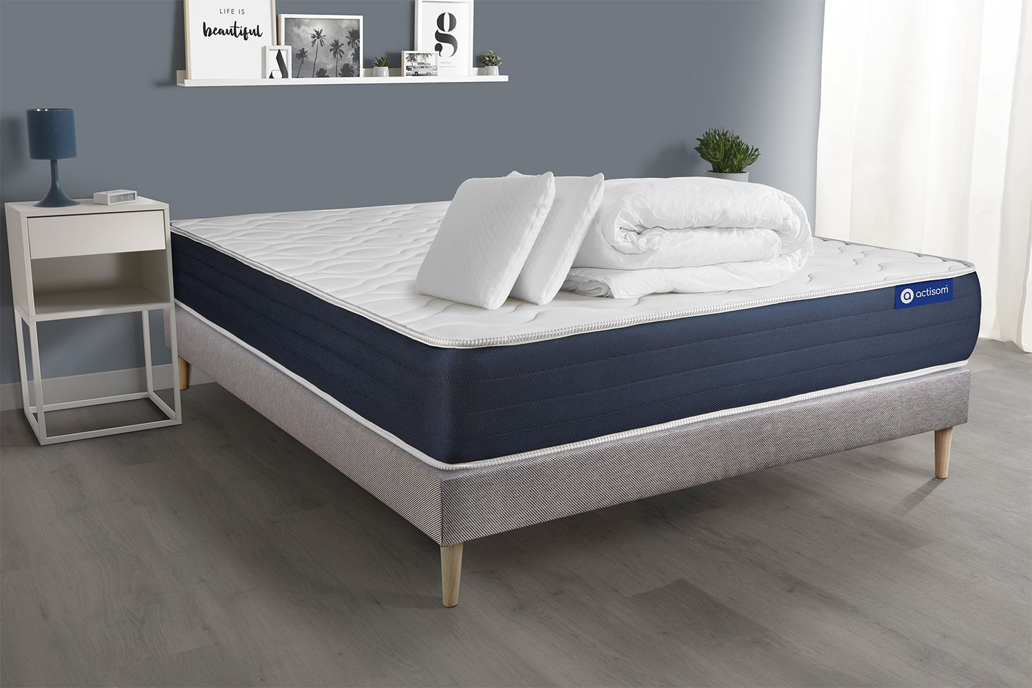 Conjunto completo de cama - Colchão 160x200 cm + estrado de molas com ripas (em kit) + 2 almofadas + edredão - Actiflex Sleep
