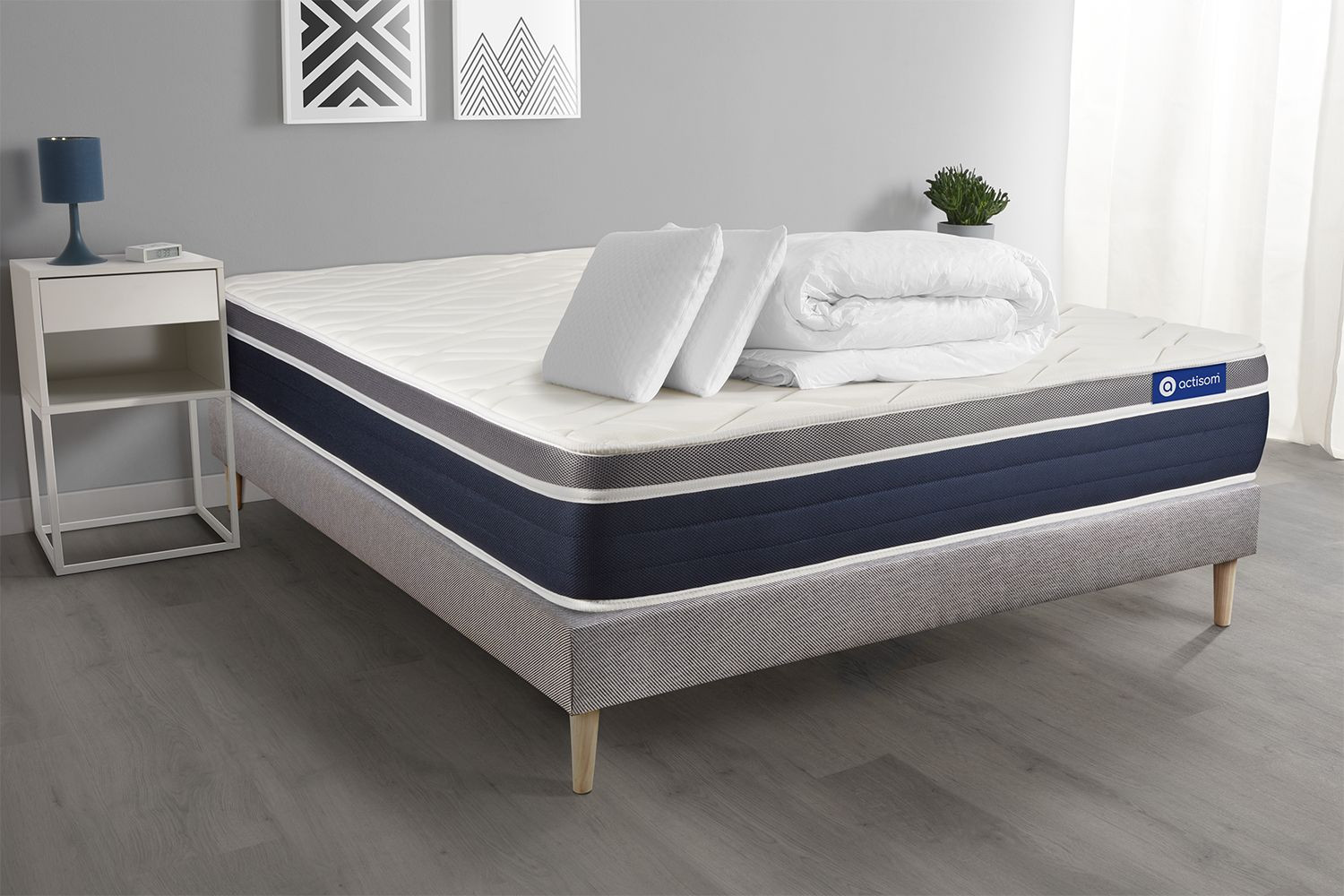 Conjunto completo de cama - Colchão 140x190 cm + estrado de molas com ripas (em kit) + 2 almofadas + Edredão - Actimemo Confort