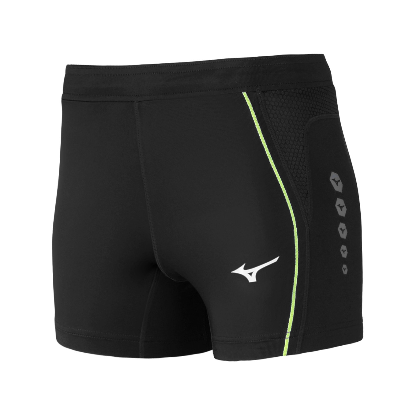 Calças curtas femininas premium Mizuno JPN tight - Tecido leve e respirável com a tecnologia Drylite. - Painéis laterais em malha jacquard para melhor liberdade de movimento. - Impressões e logótipos fluorescentes para melhor visibilidade. - 88% poliéster, 12% spandex