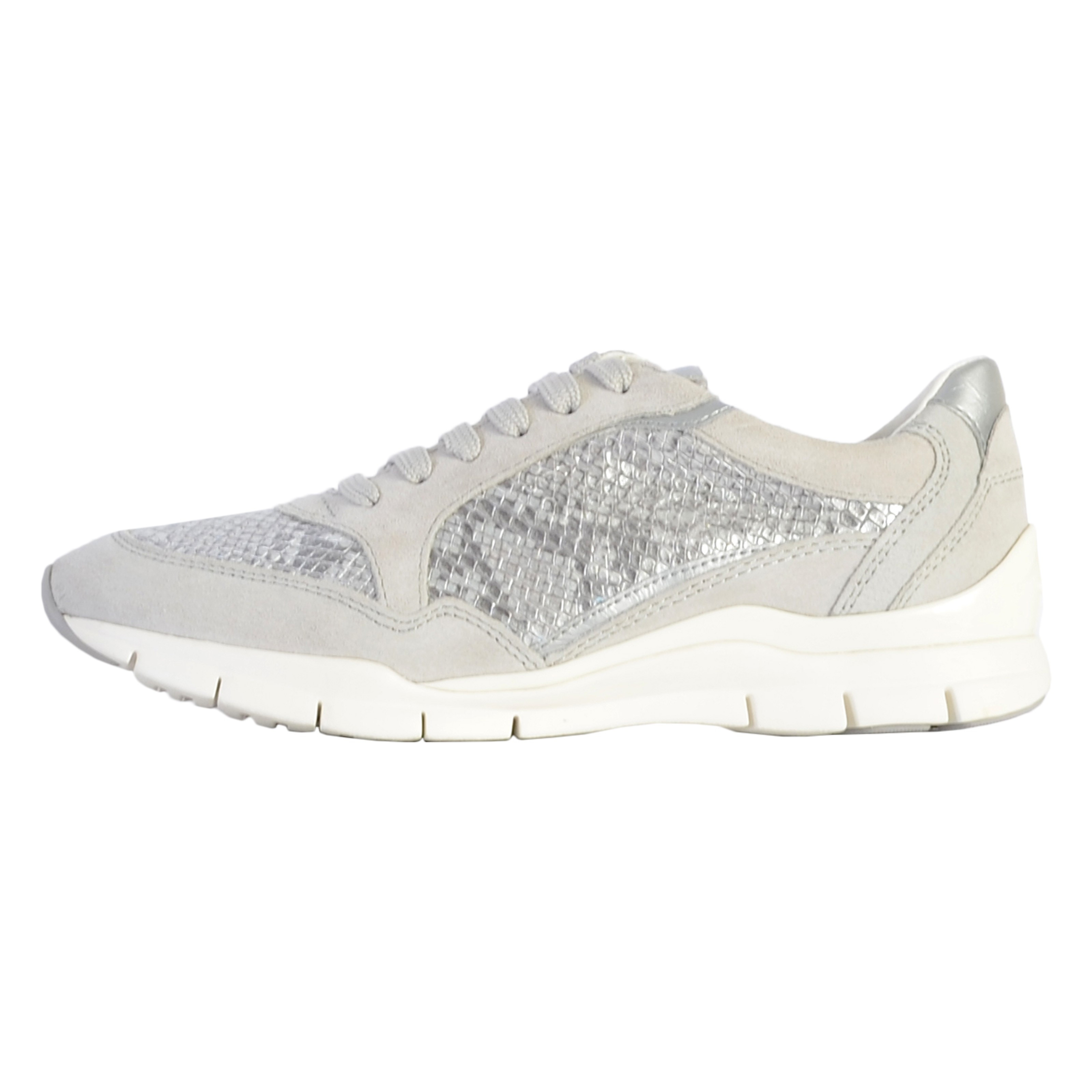 Modelo D SUKIE da marca Geox Cinza Forro de Tecido. Exterior de Pele e Sintético. Tipo de construção: Preso. Feito em Myanmar.