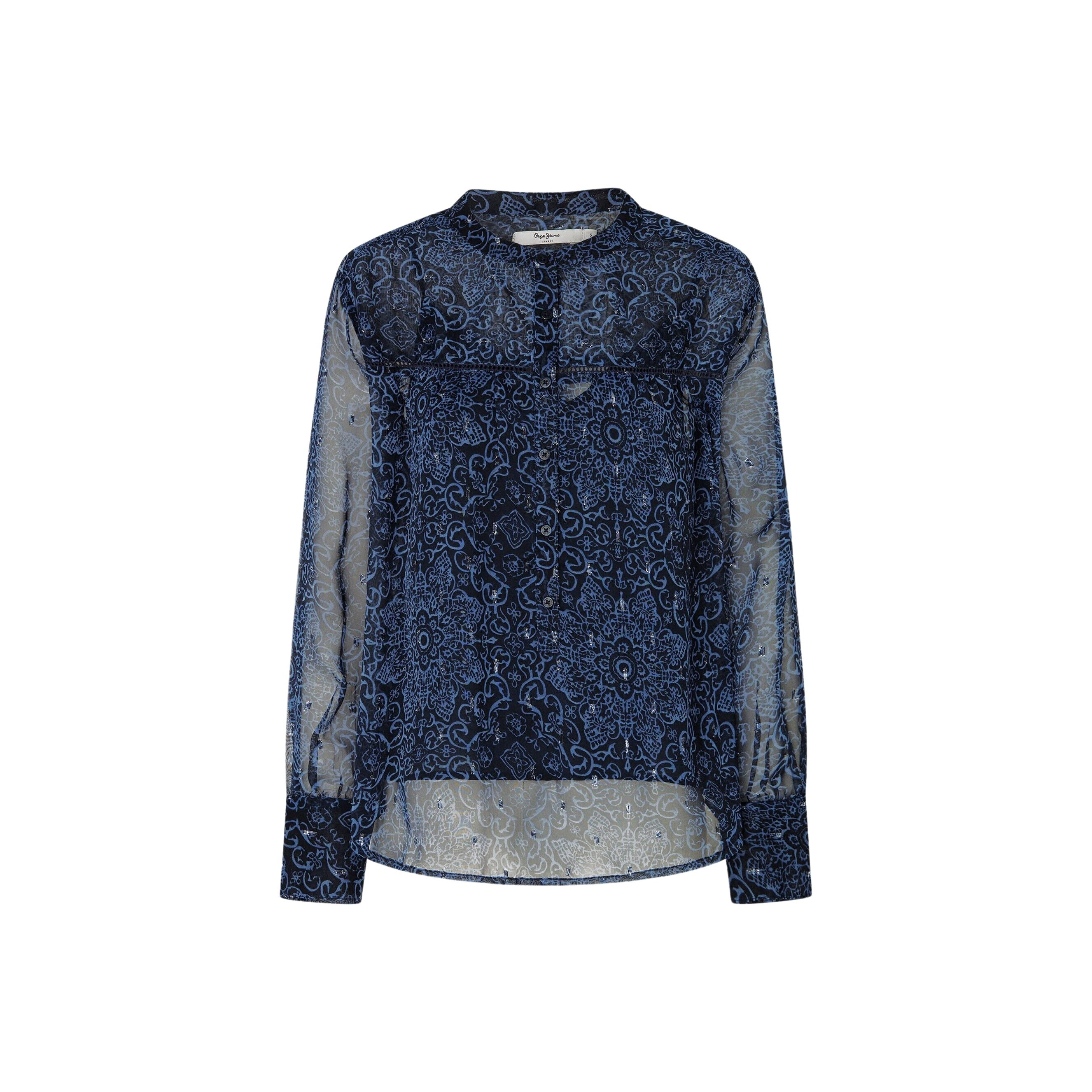 - Blusa de chiffon semi-transparente - Gola mandarim - Pormenores em rede no encaixe - Estampado floral metálico em lurex - Fecho de botões à frente - Mangas compridas bufantes - Placa metálica com logótipo PEPE JEANS nas costas - Punhos com botões COMPOSIÇÃO - 98% poliéster, 2% fio metálico