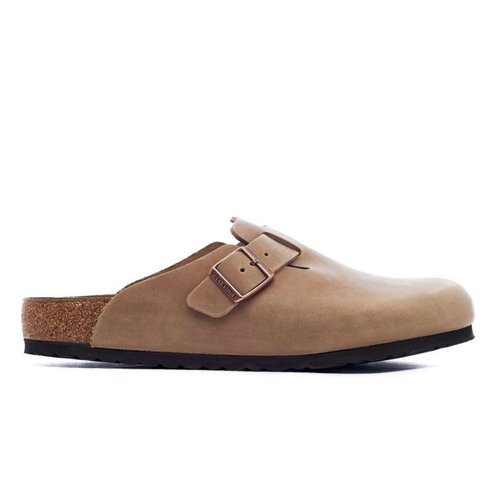Os sapatos Birkenstock Boston são feitos de pele nobuck espessa e oleada. Ajustáveis com uma fivela que assegura um ajuste preciso. A palmilha com contornos garante o posicionamento correto do pé. pé. A sola de couro é durável e proporciona uma boa aderência ao solo. A sola de couro é durável e oferece uma boa aderência ao solo.