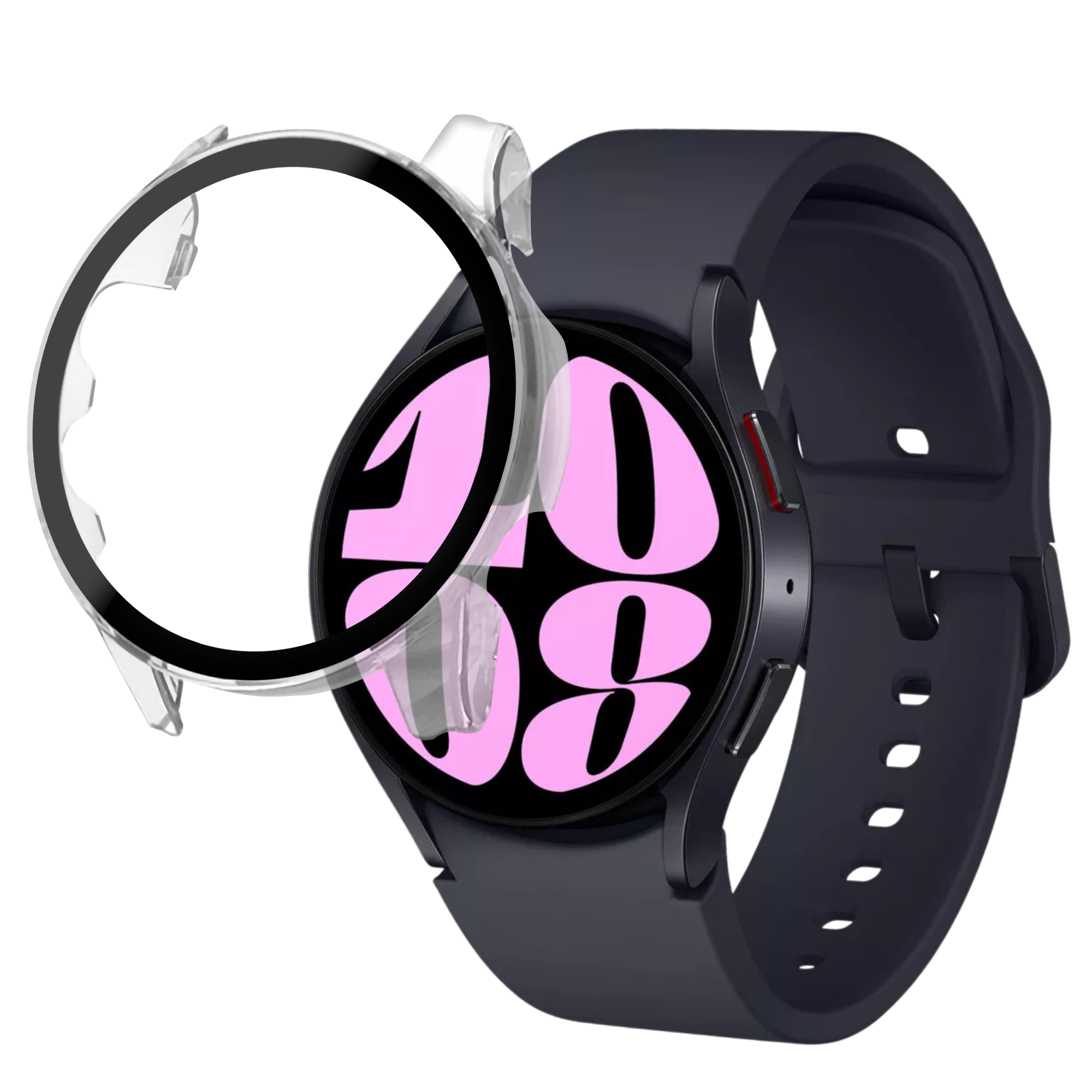 Compatível com Samsung Galaxy Watch 6 40mm. Caixa de 1 capa rígida transparente com protetor de ecrã de vidro temperado integrado e toalhetes de limpeza