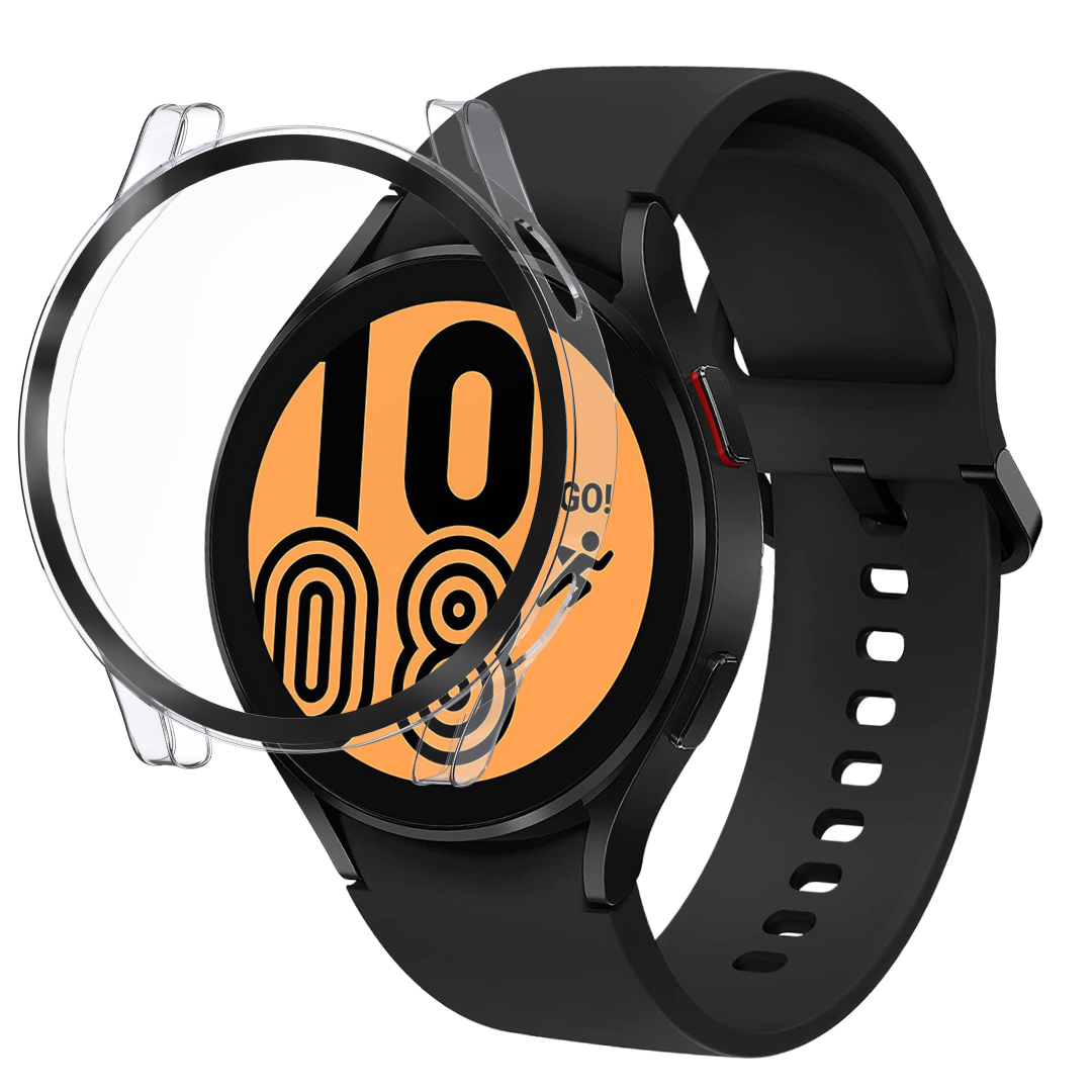 Compatível com Samsung Galaxy Watch 4 44mm. Caixa de 1 capa rígida transparente com protetor de ecrã de vidro temperado integrado e toalhetes de limpeza