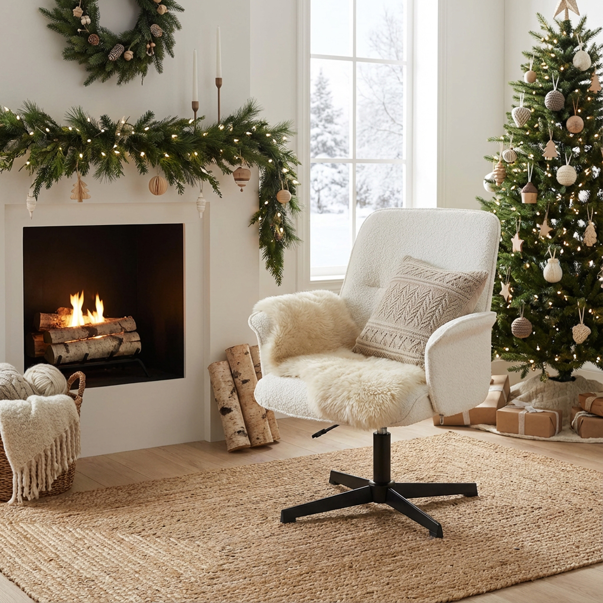 Poltrona escandinava, cadeira de toucador, sala de estar, escritório, quarto, assento giratório e altura regulável com apoio de braços em turco branco